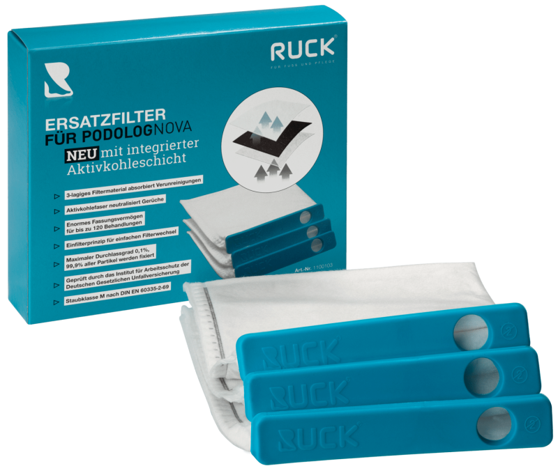 NOVO com camada de carvão ativado integrada. A sucção eficaz para dispositivos de cuidados com os pés requer filtros com alto poder de ligação. É por isso que o RUCK conta com filtros de profundidade texturizados de acordo com o padrão de teste BIA desde o início.
