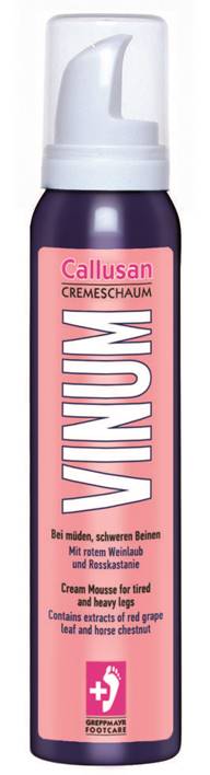 Mousse Vinum - 125ml 13,75 € Desconto de % IVA incluído Partilhar Adicionar Contactar SKU: PR-2651 Cuidados para a circulação sanguinea com a folha de videira vermelha & castanha da Índia Ureia como agente de transporte Ingrediente refrescante (Mentol) Para pés cansados e/ou pesados